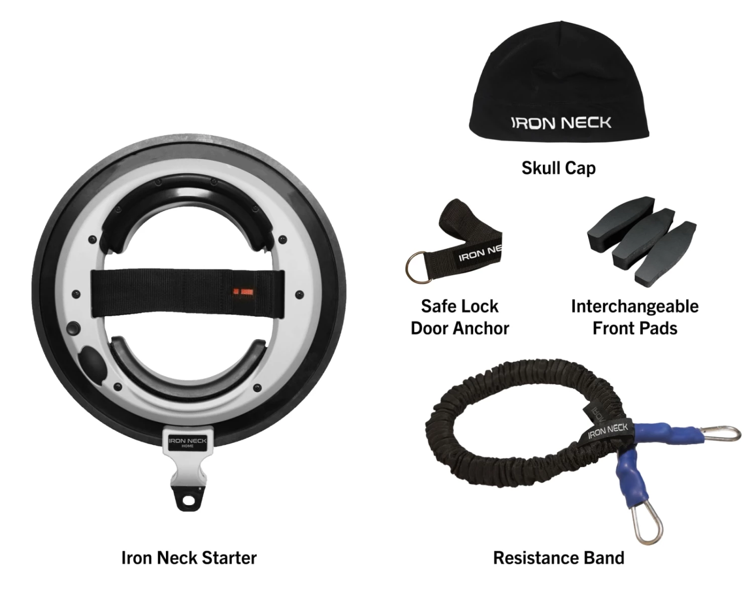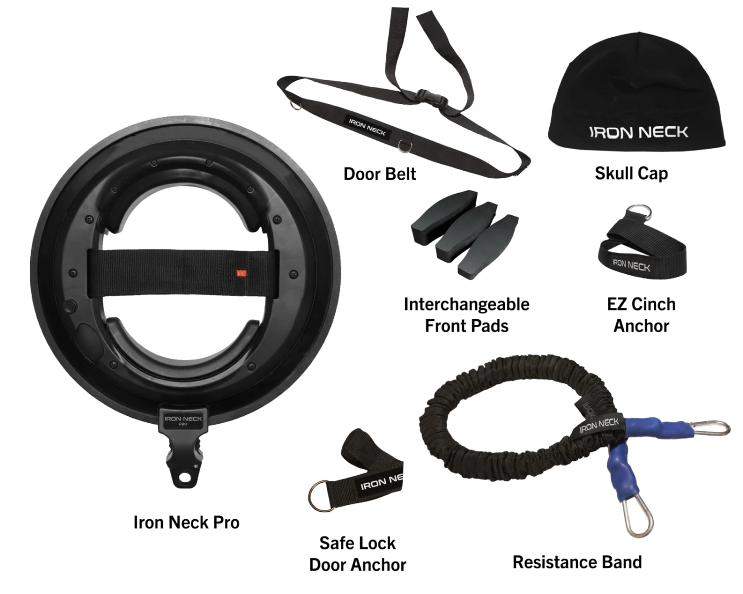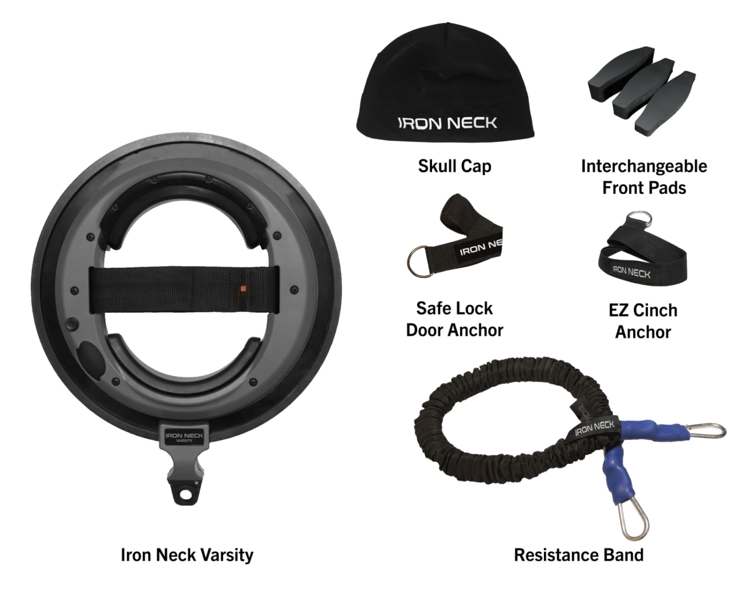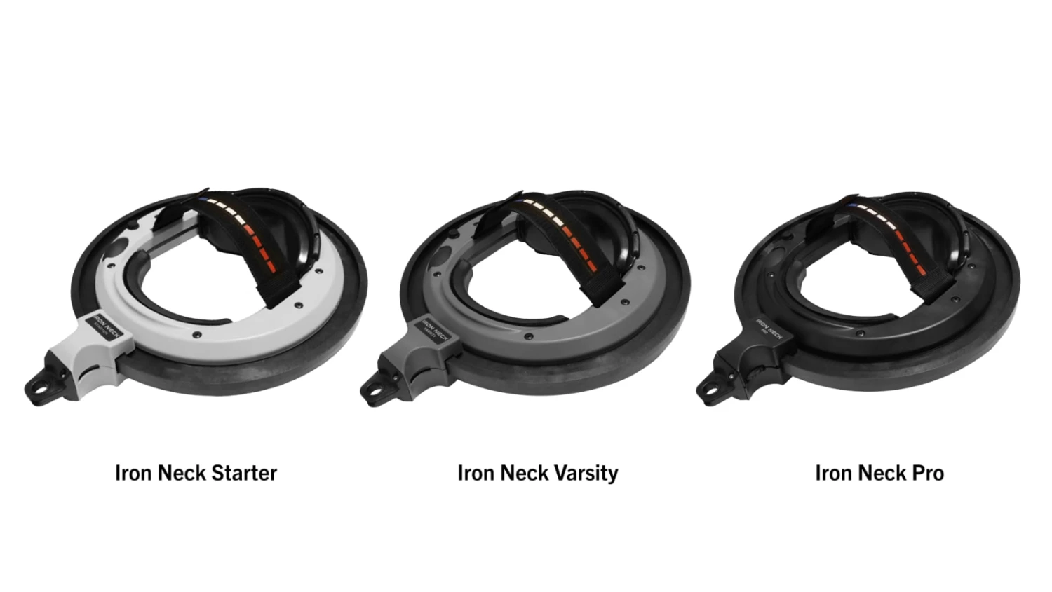 Available here in three distinct variations, the Iron Neck is a unique resistance training device—equipped as an adjustable headset—that can help athletes eliminate common neck discomfort, rehab an injury, or even reduce the risk of concussions down the road. This highly specialized neck training tool can be used with any existing weight-loaded cable pulley system, pneumatic resistance machine, or a resistance band connected to a rack/rig or any stable vertical post.